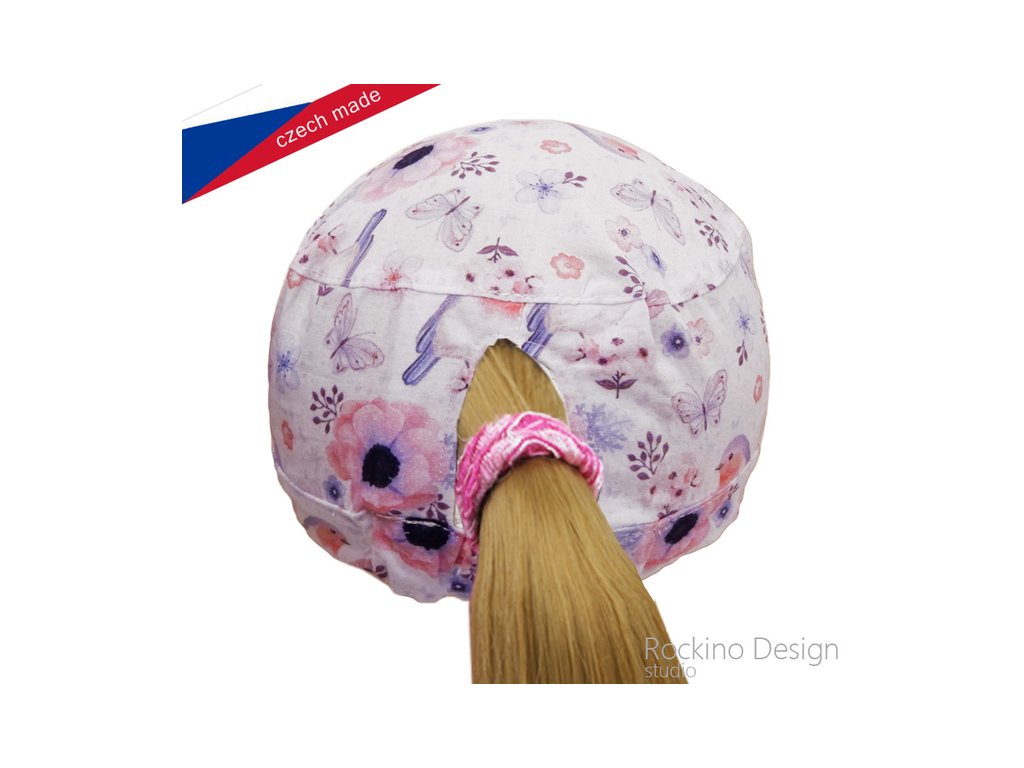 Letní kšiltovka z velmi lehkého vzorovaného plátna s větším otvorem na culík. Měkký kšilt zdobený výpustkem a vzadu pásek ve kterém je všita široká guma. Ta zajistí přizpůsobení obvodu až o 3 cm.