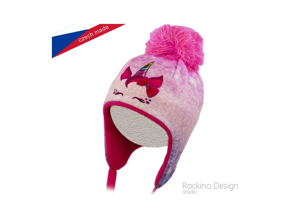 Dívčí čepice z materiálu polar - fleece. Podšívka v oblasti čela a uší také z teplejšího polaru, vrchní část čepice podšitá bavlnou. Tento model je zdoben bambulí s delším vlasem a opatřen šňůrkami do velikosti 54 (velikost 56 šijeme bez šňůrek).