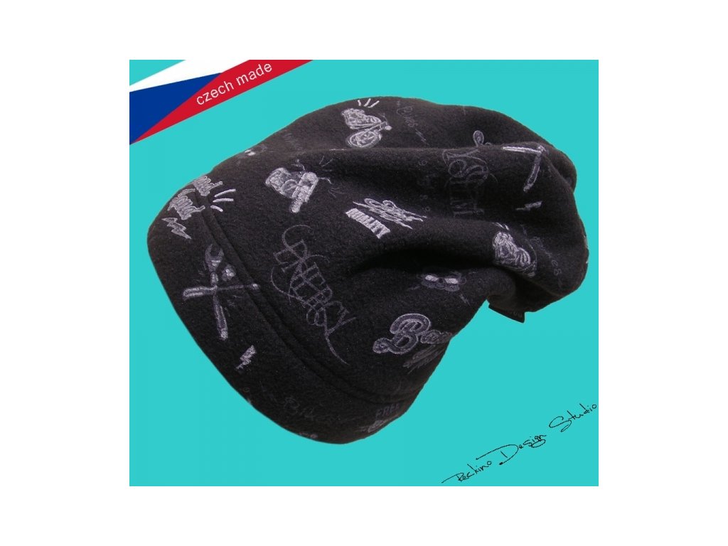 Dětská čepice ROCKINO šitá z osvědčeného materiálu Polar-fleece. Prodloužený "padený" střih a motorkářský potisk. Čepice je bez šňůrek.